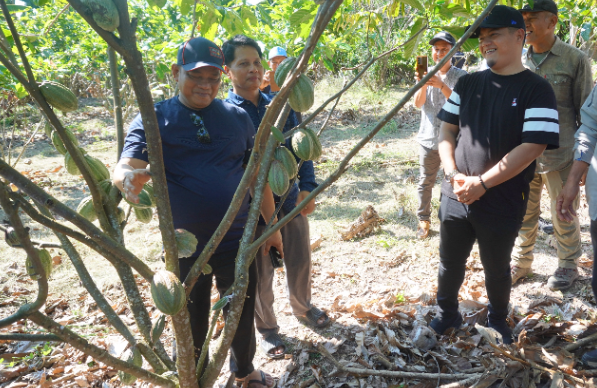 Bupati Luwu, Patahudding, meninjau perkebunan kakao milik warga yang telah tersertifikasi sebagai sumber benih biji dan entres di Desa Padang Kamburi, Kecamatan Bupon, Sabtu (25/4/2026).