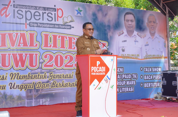 Bupati Luwu, Patahudding, membuka Festival Literasi Luwu 2025 yang mengusung tema “Literasi Membentuk Generasi Muda Luwu Unggul dan Berkarakter” di pelataran Gedung Perpustakaan Kabupaten Luwu, Senin (27/10/2025).